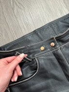 Takista löytyy olka- ja kyynärsuojat, sekä paikka selkäpanssarille. Housuissa ei ole mitään suojia. Puku on paksua nahkaa, ja housuissa riittää hyvin mittaa pidemmällekin kuskille. Kokoa 40, mutta sopii varmasti myös 38 kokoiselle.