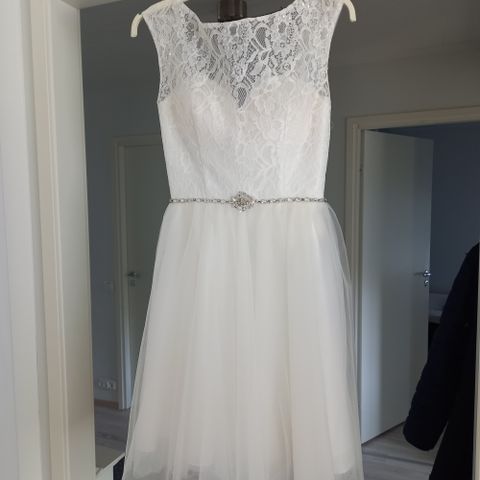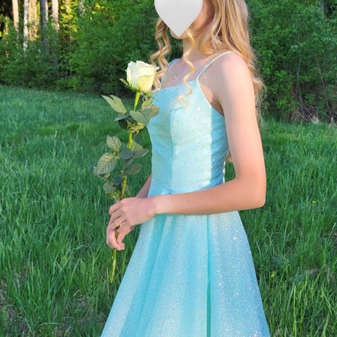 Zazabellan vaaleansininen rippi-/juhlamekko, koko 34. Vyötäröllä timantti koristenauha. Selässä nyöritys, jonka avulla helppo säätää oikean kokoiseksi.