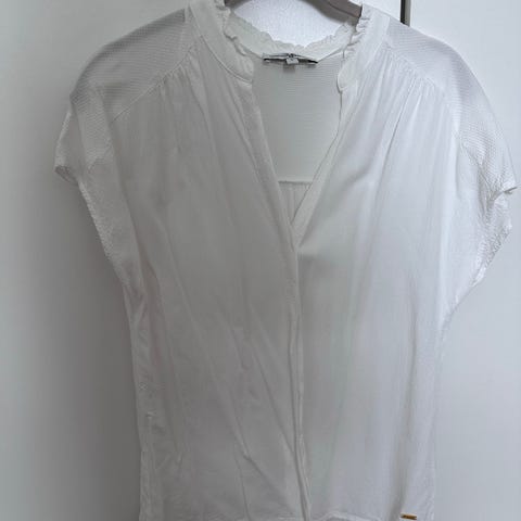 Lindexin superihana t-paita/toppi, jossa helmiäis napit. Materiaali mukavan joustavaa tenceliä, jonka väri off white. Kangas muistuttaa mukavuudeltaan nk. laamapaita. Kesätoppi/kesäpaita, joka uudenveroisessa kunnossa.