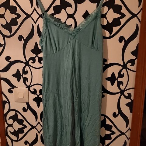 Koko S/M. Materiaali todennäköisesti puuvillaa. Ei pesuohje- tai materiaalilappua. Röyhelöhelma. Vyötäröllä vyöommel, joka ei jousta, vyötärön ympärys noin 74 cm.