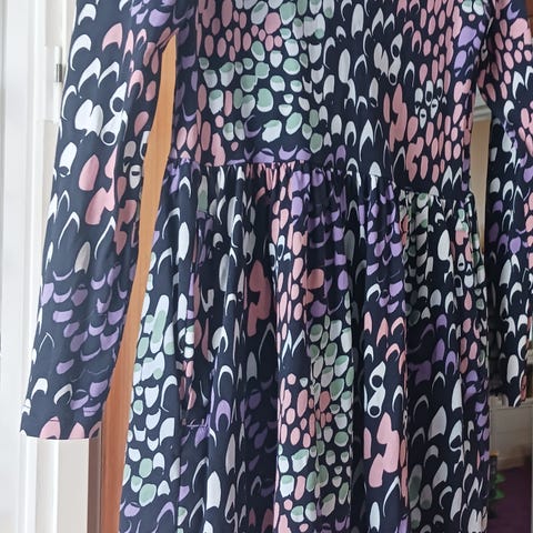 Uudenveroinen NOSH -mekko. Harmaat taskut, luonnonvaloista ja oranssinpunaista väriä. Kuminauha vyötäröllä.