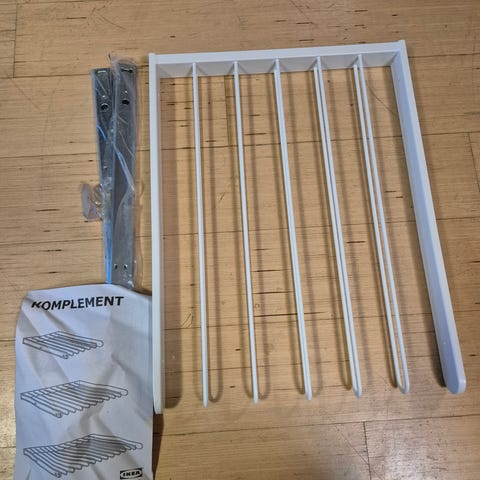 Myydään uusi Ikea Komplement -sarjan verkkokori ja kiskot. Jäi kaappiprojektista ylimääräiseksi.