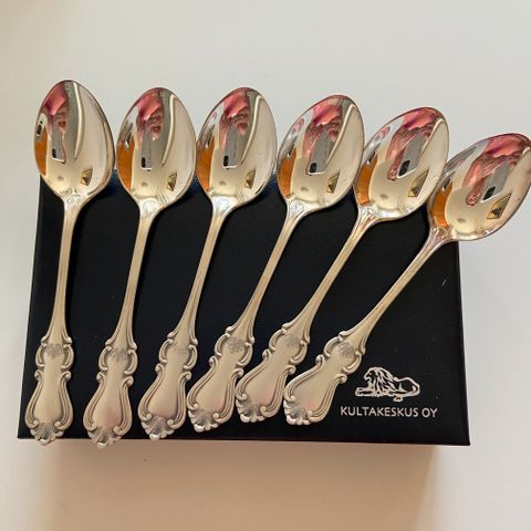 6 hopeista Romantiikka-kahvilusikkaa. Kaiverrettu nimi (Jonna). Käyttämättömät. Nouto Laajalahdesta tai Toridiili.