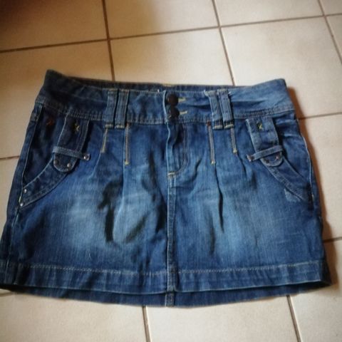 Espritin farkkuminihame. Koko n. L, vyötärön leveys venyttämättä 44cm, joustaa hieman. Koko pituus 45cm.