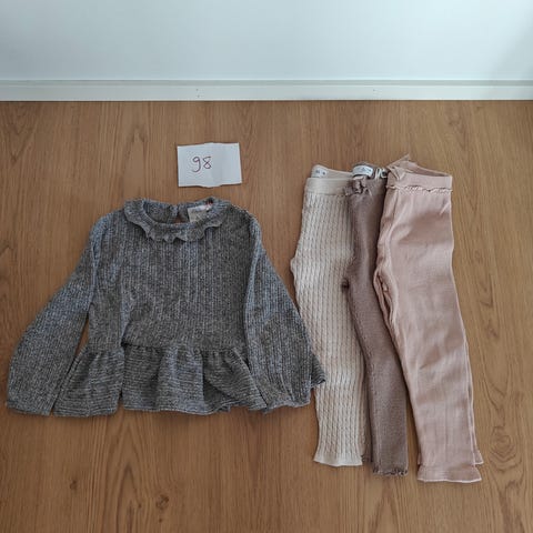 Kerran käytetty neuletakki, pari kertaa käytetty kauluspaita ja siistit caprit (koko98 cm) joista saa vetoketjulla lyhennettyä shortseiksi kokoa 98/104 cm.