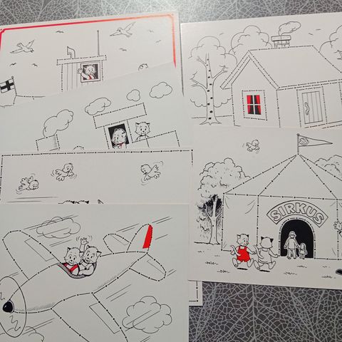 Mukana 8 A5 kokoista värikästä kuvaa ja neula.