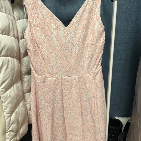 Muutaman kerran käytetty, vuorillinen koristehelmainen polvipituinen juhlamekko.