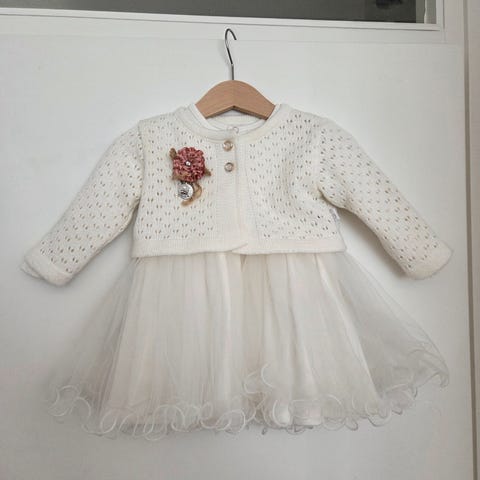 Pituus niska-helma 51 cm, alushame, joustava miehusta, punainen neulebolero. Kaunis!!