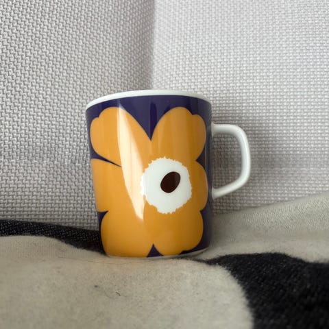 Marimekko Oiva - Unikko 50 vuotta muki 2,5 dl, violetti-keltainen. Design: Maija Isola. Käyttämätön, tarra paikoillaan. Vaikka lahjaksi :) Hinta 100 euroa sis postikulut. Nouto Kempele onnistuu myös.