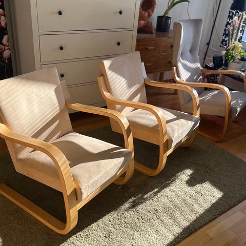 Myydään hyväkuntoinen Artek 402 nojatuoli. Kaunis pellavan värinen kangas. Puuosat hyväkuntoiset. Pieniä iän aikana kertyneitä jälkiä.