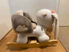 Yksi repeämä istuimessa ja pieniä tahroja. Muuten erittäin hyväkuntoinen Nattoun keinueläin. Pehmeää kangasta.