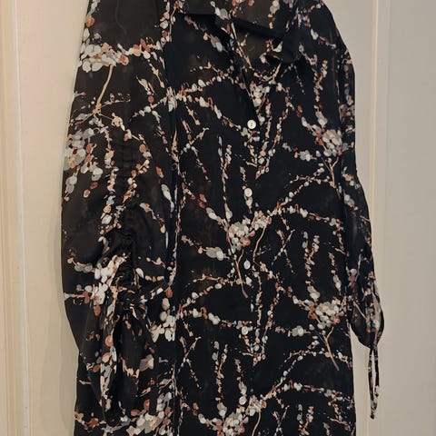 Janina F valkoinen lyhythihainen juhlavampi paita kokoa M. Ulottuu lanteille. Herkkä lintukuvio oikealla ylhäällä. Etupuolella miellyttävä vuorikangas. Etuosa hyvin laskeutuvaa silkin oloista kangasta. Hyväkuntoinen.