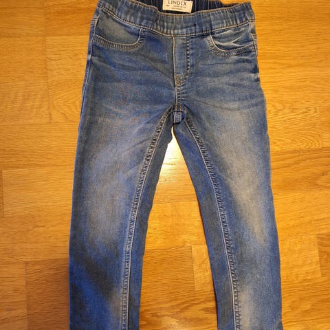 Uudet Lindex farkut koossa 98, eivät ehtineet käyttöön meillä. Tapered leg eli reisistä väljät, kapenevat lahkeet. Kiristyskuminauha vyötäröllä ja koristenappi, ei oikeaa napinläpeä eikä vetoketjua. Kangas jämäkkää farkkua, mutta joustoakin on.