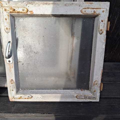 Karmi ja kaksinkertaiset ikkunat. Korkeus 149,5 cm, leveys 128 cm, karmin leveys 17 cm