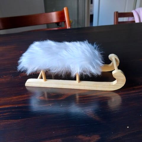 Käsittääkseni tytön ja kelkan istuinosan materiaali on polyresiinia ja kelkan jalakset ovat metallia.