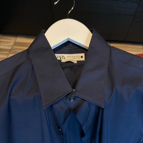 Tyylikäs tummansininen ZARA Slim Fit-mallinen kauluspaita. 60% puuvillaa, 40% polyesteriä. Kevyt, siististi istuva malli, sopii hyvin arkeen tai juhlaan. Hyvä kunto, ei tahroja tai reikiä, vähäisiä käytön jälkiä. Napit tallessa, siisti yleisilme.