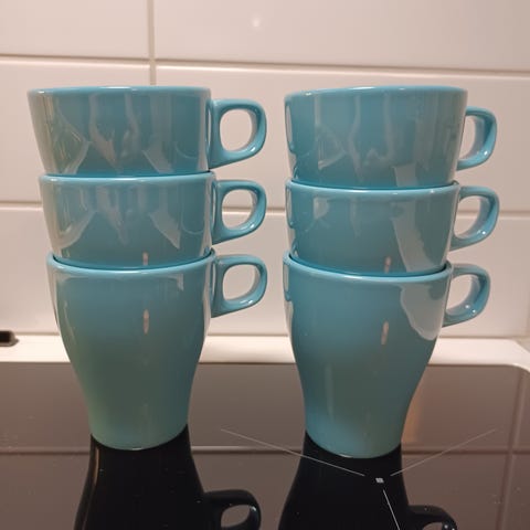 Moitteettomassa kunnossa olevat kahvikupit ja lautaset.