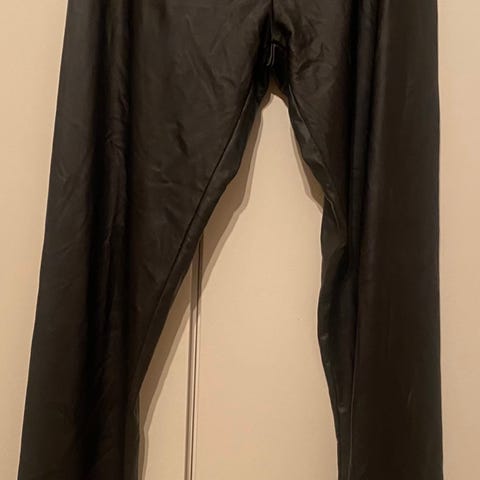 Tässä tarjolla Polan housut, jotka materiaaliltaan muistuttavat nahkaa. Materiaali on kuitenkin 76 % viskoosia, 20 % polyamidia ja 3 % elastaania. Koko on 40, mutta minusta se on liian paljon, oikea koko olisi minusta 38. Siksi tärkeimmät mitat: vyötäröstä haaraan 27 cm, vyötärön leveys 4 cm, vyötärön ympärys 76 cm ja lahkeen pituus 95 cm. Lahkeissa olevat vetoketjut ovat 15 cm pitkät. Hoito-ohje vaatteessa. Housut ovat käyttämättömät.