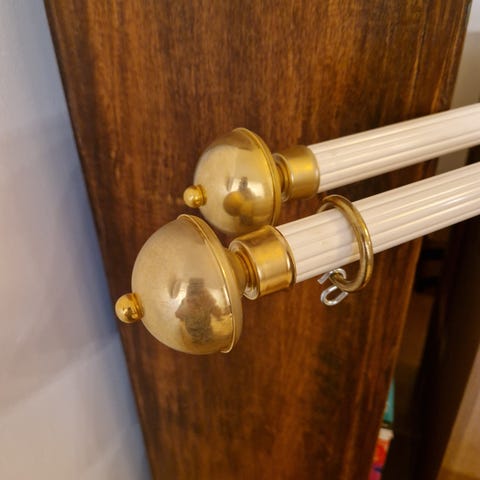 Vanhan verhotangon seinäkannakkeet 3kpl. (Jos tanko on pitkä on hyvä olla kolmet kannakkeet). 26kpl. renkaita ja niissä kaikissa alkuperäiset klipsit, sekä 2 kpl. verhotangon päitä. Toisessa pieni klommo, sen voi vääntää seinään päin, niin ei näy. Tai lämpimän veden alla painaa paikoilleen. Se nyt kuuluu vanhaan että pientä elämisen merkkiä löytyy. Itselläni ollut puinen tanko, en nyt muista oliko verhotanko vaiko pyörölista, niitäkin löytyy paksuudeltaan juuri sopivia tähän seinäkannakkeseen. Itse petsasin ruskealla, niin näyttää vanhalta.