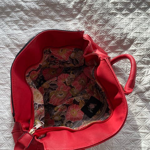 Tässä tarjolla vaaleanpunainen käsi-/olkalaukku, joka on kooltaan 25 cm leveä, 19 cm korkea ja 5 cm paksu. Laukussa on kaksi koteloa, siksi edessä on kaksi nepparilukkoa. Hihnan pituus on 115 cm.