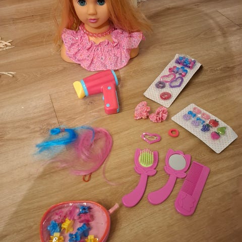 Kampauspään korkeus 23 cm. Mukan 2 irtolettiä, peili, harja, fööni ja hiuslenkkejä. Ikäsuositus 3+.