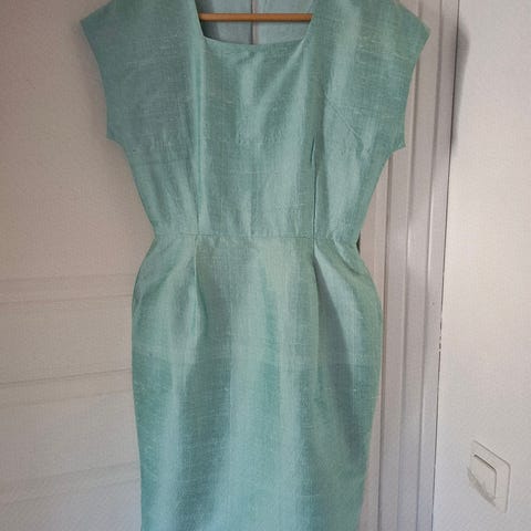 Tummansininen (osassa kuvia väri= huti, on tummansininen, ei valju), vuorillinen, v- aukko edessä ja takana halkio. Iltapukunakin toimisi. Jos haluaa minimalismista pois, niin ompelee päälle pitsiä tms ohutta ihanaa kangasta. Tai lisää jotain koristeita / kirjailuja joko vain pääntiehen tai koko mekkoon. Itse entrasin yhtä mekkoa niin, et kiinnitin höyhenpuuhkasta osan pääntiehen ihan vaan hakaneuloilla.
