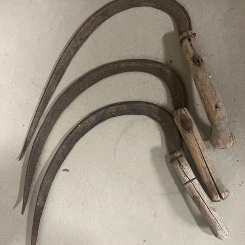 2kpl vanhoja sirppejä, erikseen ostettuna 8€/kpl