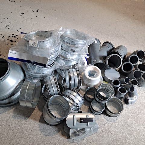 Ilmvaihtokanaviston osia 100, 125, 160 pääosin peltisiä, mutta myös muovisia osia. Hinnat alkaen 2 € / kpl. Pientalon kanavakoot ovat näitä kokoja. Hinnat koskevat vain varastossa olevia osia. Myös äänenvaimentimia ja Vilpen läpivientiputkia löytyy. Vilpen värit musta ja ruskea. Muoviosat sinisiä UPONOR tai mustia tuntematon valmistaja. Tee lista mitä tarvitset, nopeat syövät hitaat. HINNAT VOIMASSA VAIN NYKYISEEN VARASTOON