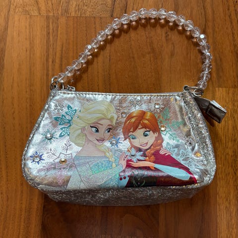 Ihana uusi Elsa ja Anna laukku vetoketjulla 48 cm <>, 31 cm ^, pohja 15 cm laaja ja päältä 9 cm laaja,kahva 59 cm pitkä