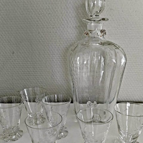 Ryppy-liköörikarahvi 2071 75 cl, Erkki Vesanto. Kaunis vanha Erkki Vesannon suunnittelema karahvi on ollut Iittalan tuotannossa v. 1947-1951. Korkeus ilman korkkia n. 18,5 cm ja korkin kanssa 22 cm.