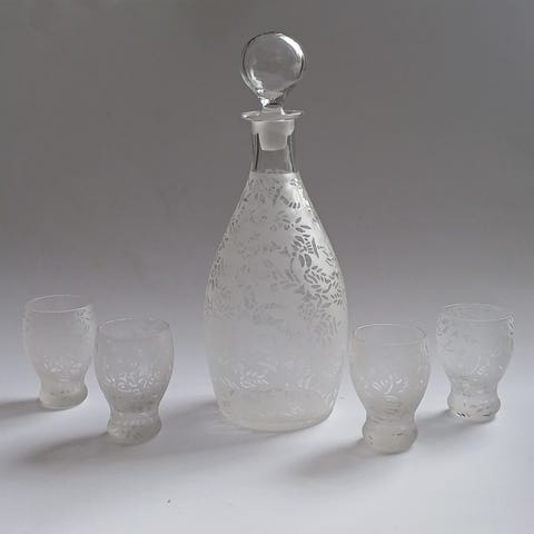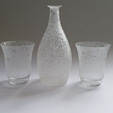 Kirkas lasikarahvi on suupuhallettu, driivattu, punttelin jälki hiottu. Alaosan jalusta ja koristeruusukkeet tehty muotopuristimella. Korkki tulpattu, siinä yksi ruusuke.