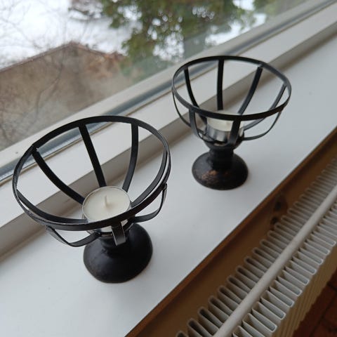 Lasinen sydänkoriste ja metallinen tuikkukynttilänjalka. Sydänkoristeessa on kirkkaasta lasista valmistettu suorakulmainen runko, jonka sisällä on punainen sydänmuoto. Koriste sopii esimerkiksi pöydälle tai hyllylle. Metallinen tuikkukynttilänjalka koostuu kivipintaisesta jalustasta ja mustasta metallikehikosta, jossa on kasvokuvio ja paikka tuikkukynttilälle. Molemmat esineet ovat sisustusesineitä kotiin.