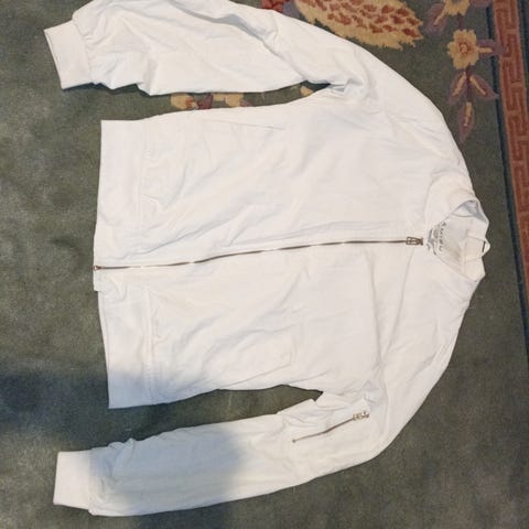 Valkoinen saatinikankainen rento takki käärittyinä hihoilla ja neppareilla. Löysähkö malli menee M koolle.
