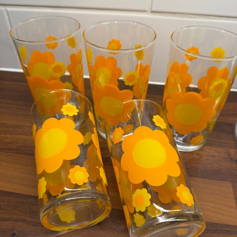 Myydään retro/vintage kukkakuvioiset juomalasit. Ohutta lasia, 5 kpl.