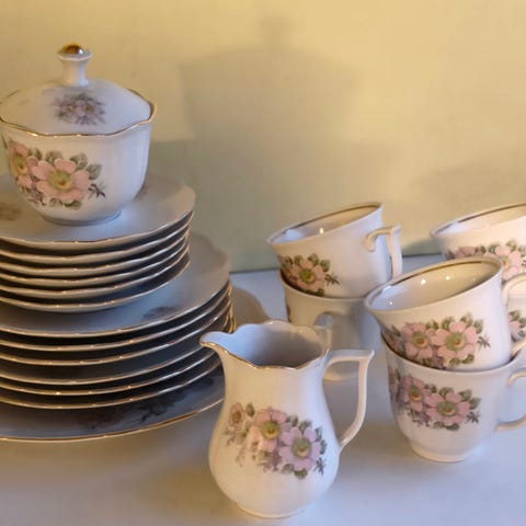 Myynnissä kaunis kukkakoristeisesti maalattu kiinalainen kahviastiasto: Sisältää 6 kahvikuppia, 6 aluslautasta ja 6 kakkulautasta. Isäni ostanut aikoinaan ja jäänyt hänellä käyttämättömäksi.