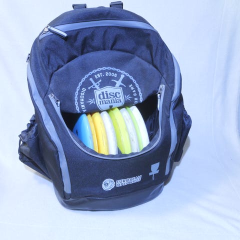 Myynnissä Latitude 64 kiekkoreppu, johon mahtuu hyvin 19 kiekkoa.