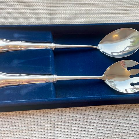 Hyväkuntoiset Chippendale-salaatinottimet. Varret hienosti kiiltävää hopeaa, kärkiosat ruostumatonta terästä. Ei kaiverruksia.