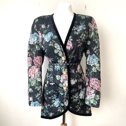 Vihreä puhdassilkkinen takki kiinalaistyylisellä napeilla ja kiinnityksellä. Tikattu/brodeerattu. Päällisen ja vuorin välissä on pehmustetta. Ei kokomerkintää, sopii noin M-kokoiselle.