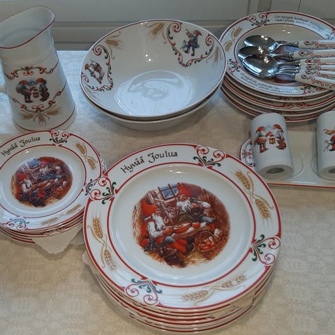Uusi 12 hengen astiasto, käyttämätön. Syviä, matalia ja alkuruokalautasia kaikkia 12. Keittokulho, useita tarjoiluastioita.