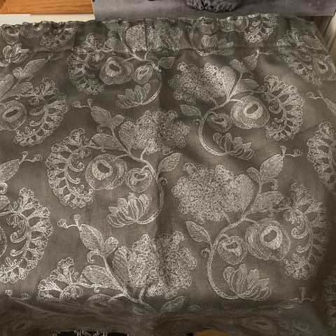 Vallilan kappaverho. Moitittavaa en löytänyt. Leveys noin 240 cm, korkeus noin 60 cm. Allergiaystävällinen koiratalous.
