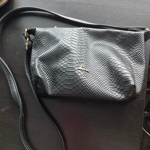 Näyttävä ruskea olkalaukku käärmeennahkakuosilla. Keinonahkaa, magneettinepparikiinnitys ja kaksi sisälokeroa mustalla vuorilla. Hihna on säädettävä metallisolkien avulla. Ulkopuoli hyväkuntoinen. Siisti kunto, kevyt käytön jälki metalliosissa sekä taittokohdassa. Koko n.24x 20 x 3cm