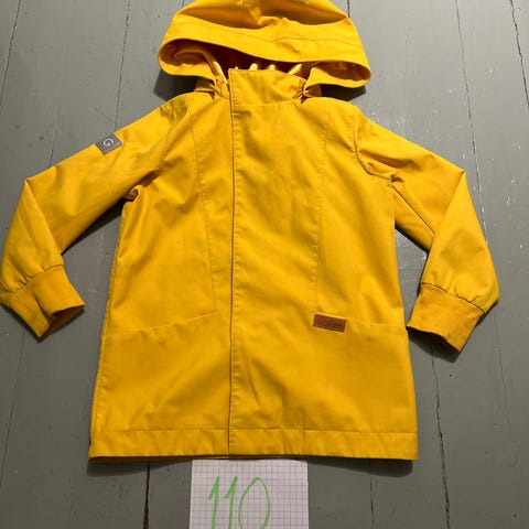Gugguun välikausitakki. Koko 110. Yleisilmeeltään siisti. Ei ole ollut käytössä pihaleikeissä. Kertaalleen pesty. Aran värin vuoksi jotakin haaleaa tahraa paikka paikoin on havaittavissa. Ylimmän nepparin ympäriltä kangas hieman kulunut ja sisäpuolella ja takana kankaassa jotakin kulumaa. Näistä kuvat.