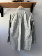 Hyväkuntoinen naisten kauluspaita. Merkki Muji, koko XS, väri hieman vihreään taittava harmaa. 74% puuvillaa, 26% kapokkia.