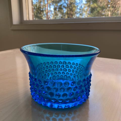 Kuva 5 ja 6. Näppylämalja,Koboltti, korkeus 9.5 cm, halkaisija n 15 cm, 25 eur