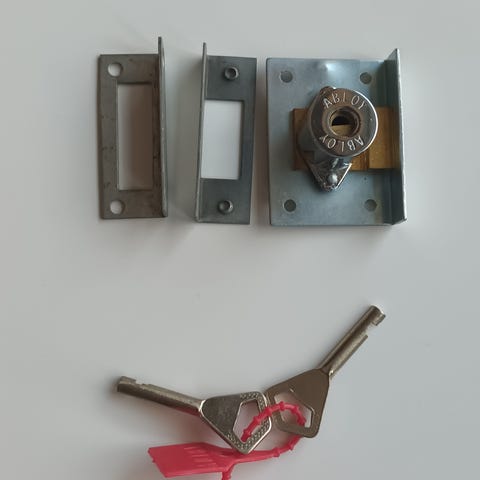 Erilaisia tarvikkeita. 1kpl lukkovastapala Abloy 4690. 2kpl papukaijakannakkeet korkeus on 7cm, toinen on hopean värinen ja toinen on metallin värinen. 1kpl muovirunkoinen kalustelukko+avainhela+2avainta. 1kpl metallirunkoinen Abloy kalustelukko+2avainta. 8kpl laakerit, ulkohalkaisija on 27mm, sisähalkaisija on 12mm, vahvuus on 8mm. Kaikki käyttämättömiä mutta Vanhoja. Yhteishintaan 25 euroa.