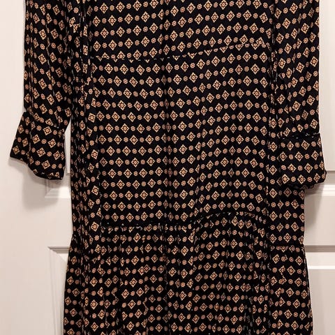 Indiskan viskoosimekko/pitkä tunika. Pituus 92 cm, kainalo-kainalo 47 cm. Kokomerkintä S, mutta sopinee myös M-kokoa käyttävälle. Ohuehkoa, nätisti laskeutuvaa kangasta. Hihansuissa ja helmassa kaitale mustaa reikäommelta. Hihat 3/4 pituus.