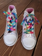 Myydään ihanat hopean väriset tennarit värikkäillä nauhoilla. Sivussa vetoketju. Pientä naarmua kengän kärjissä, kumiosassa, mutta ei ole rikki mistään.