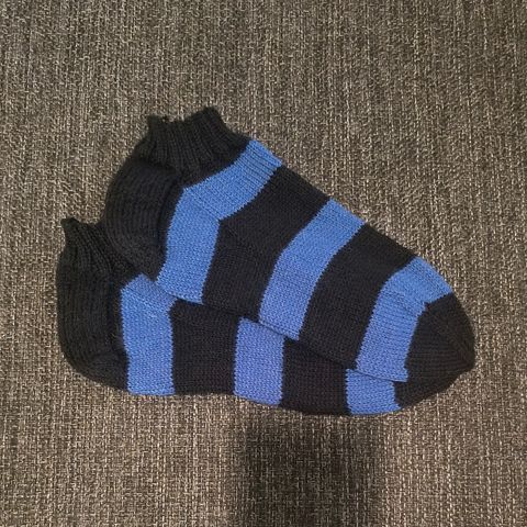 Lyhytvartiset/varrettomat kirjavat villasukat. Neulottu ohuesta sukkalangasta, 75% villaa ja 25% polyamidia. Koko 37/38.