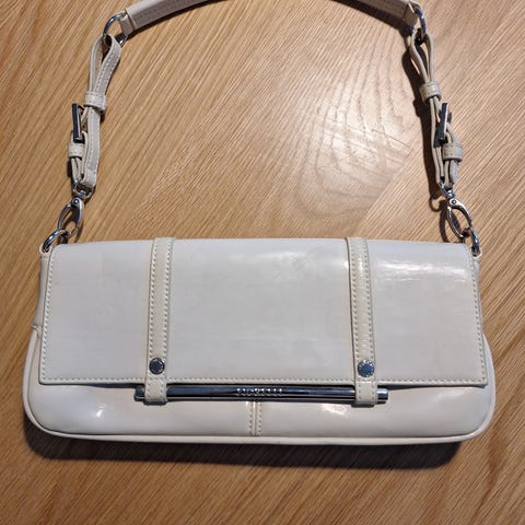 Kaunis, pitsikuvioinen, valkoinen kirjekuorimallinen pikkulaukku tekonahkasta. Merkki Ulrika. Laukku on käyttämätön. Suljetaan magneettilukolla. Olkahihna on irroitettava ja sen pituus 104 cm. Laukun koko 22×11 cm. Taloudessamme ei tupakoida, eikä ole kotieläimiä.