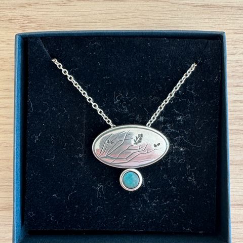 Kalevalan Naisen voima pronssinen kaulakoru, kivi Spektroliitti, pituus 46-51 cm, koristeosan korkeus 28 mm, leveys 31 mm. (Valmistus lopetettu.)